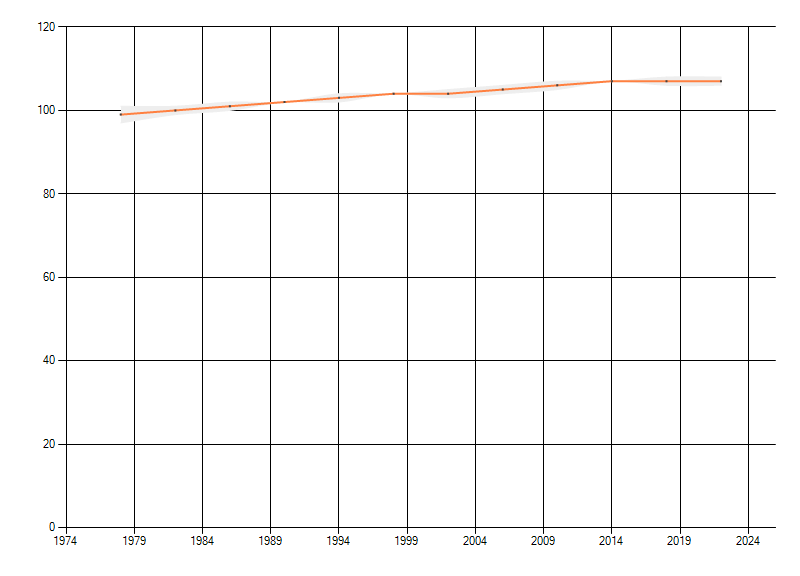 Gemiddelde trend van het aantal kilometerhokken waarin de soort voorkomt, weergegeven als indexcijfer (1975-1978 = 100). De trend is gecorrigeerd voor waarnemersinspanning en geeft de relatieve verandering in het aantal bezette kilometerhokken weer. Voor de berekening worden de data per periode van vier jaar samengenomen. In de grafiek correspondeert ieder punt met het laatste jaar van zo'n periode.