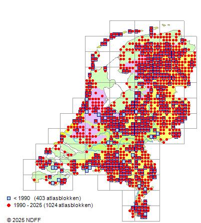 Het aantal atlasblokken (5x5 km) waarin de soort is gemeld binnen een periode van vijf jaar (vanaf 1980) of twintig jaar. Niet gecorrigeerd voor waarnemersinspanning en het aantal doorgegeven waarnemingen kan sterk variëren per periode, dus een trend in verspreiding kan hier niet direct uit worden afgelezen. Het opgegeven jaartal is het eerste jaar van de periode. Bron: gevalideerde waarnemingen uit de NDFF.