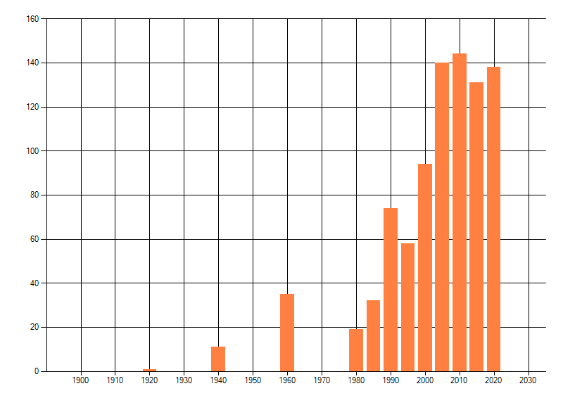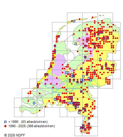 Het aantal atlasblokken (5x5 km) waarin de soort is gemeld binnen een periode van vijf jaar (vanaf 1980) of twintig jaar. Niet gecorrigeerd voor waarnemersinspanning en het aantal doorgegeven waarnemingen kan sterk variëren per periode, dus een trend in verspreiding kan hier niet direct uit worden afgelezen. Het opgegeven jaartal is het eerste jaar van de periode. Bron: gevalideerde waarnemingen uit de NDFF.