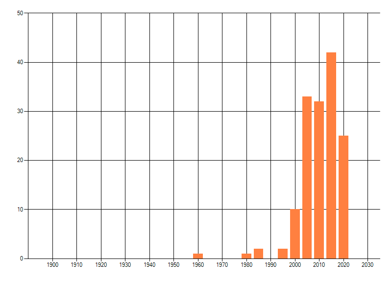 Het aantal atlasblokken (5x5 km) waarin de soort is gemeld binnen een periode van vijf jaar (vanaf 1980) of twintig jaar. Niet gecorrigeerd voor waarnemersinspanning en het aantal doorgegeven waarnemingen kan sterk variëren per periode, dus een trend in verspreiding kan hier niet direct uit worden afgelezen. Het opgegeven jaartal is het eerste jaar van de periode. Bron: gevalideerde waarnemingen uit de NDFF.