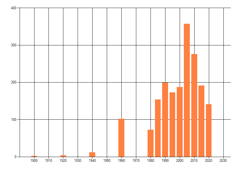 Het aantal atlasblokken (5x5 km) waarin de soort is gemeld binnen een periode van vijf jaar (vanaf 1980) of twintig jaar. Niet gecorrigeerd voor waarnemersinspanning en het aantal doorgegeven waarnemingen kan sterk variëren per periode, dus een trend in verspreiding kan hier niet direct uit worden afgelezen. Het opgegeven jaartal is het eerste jaar van de periode. Bron: gevalideerde waarnemingen uit de NDFF.