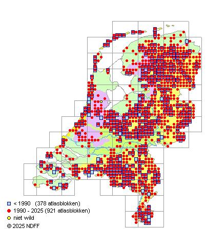 Het aantal atlasblokken (5x5 km) waarin de soort is gemeld binnen een periode van vijf jaar (vanaf 1980) of twintig jaar. Niet gecorrigeerd voor waarnemersinspanning en het aantal doorgegeven waarnemingen kan sterk variëren per periode, dus een trend in verspreiding kan hier niet direct uit worden afgelezen. Het opgegeven jaartal is het eerste jaar van de periode. Bron: gevalideerde waarnemingen uit de NDFF.