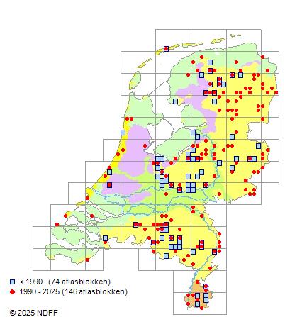 Het aantal atlasblokken (5x5 km) waarin de soort is gemeld binnen een periode van vijf jaar (vanaf 1980) of twintig jaar. Niet gecorrigeerd voor waarnemersinspanning en het aantal doorgegeven waarnemingen kan sterk variëren per periode, dus een trend in verspreiding kan hier niet direct uit worden afgelezen. Het opgegeven jaartal is het eerste jaar van de periode. Bron: gevalideerde waarnemingen uit de NDFF.