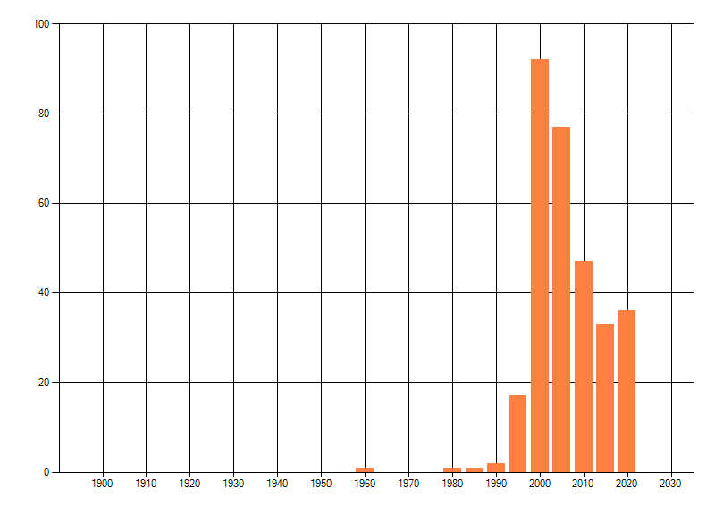 Het aantal atlasblokken (5x5 km) waarin de soort is gemeld binnen een periode van vijf jaar (vanaf 1980) of twintig jaar. Niet gecorrigeerd voor waarnemersinspanning en het aantal doorgegeven waarnemingen kan sterk variëren per periode, dus een trend in verspreiding kan hier niet direct uit worden afgelezen. Het opgegeven jaartal is het eerste jaar van de periode. Bron: gevalideerde waarnemingen uit de NDFF.