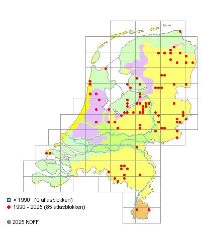 Het aantal atlasblokken (5x5 km) waarin de soort is gemeld binnen een periode van vijf jaar (vanaf 1980) of twintig jaar. Niet gecorrigeerd voor waarnemersinspanning en het aantal doorgegeven waarnemingen kan sterk variëren per periode, dus een trend in verspreiding kan hier niet direct uit worden afgelezen. Het opgegeven jaartal is het eerste jaar van de periode. Bron: gevalideerde waarnemingen uit de NDFF.