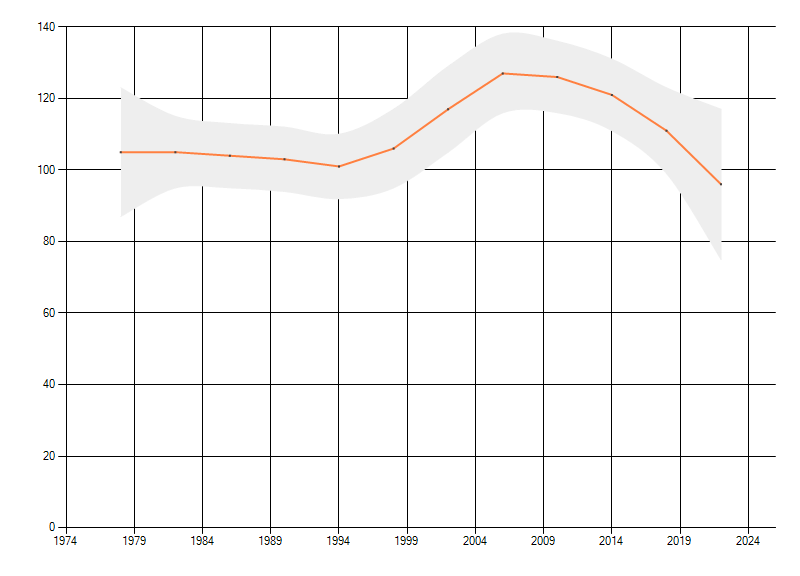 Gemiddelde trend van het aantal kilometerhokken waarin de soort voorkomt, weergegeven als indexcijfer (1975-1978 = 100).
