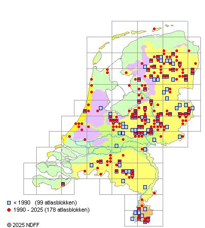 Het aantal atlasblokken (5x5 km) waarin de soort is gemeld binnen een periode van vijf jaar (vanaf 1980) of twintig jaar. Niet gecorrigeerd voor waarnemersinspanning en het aantal doorgegeven waarnemingen kan sterk variëren per periode, dus een trend in verspreiding kan hier niet direct uit worden afgelezen. Het opgegeven jaartal is het eerste jaar van de periode. Bron: gevalideerde waarnemingen uit de NDFF.