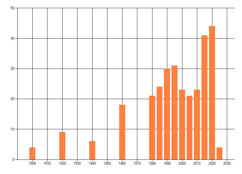 Het aantal atlasblokken (5x5 km) waarin de soort is gemeld binnen een periode van vijf jaar (vanaf 1980) of twintig jaar. Niet gecorrigeerd voor waarnemersinspanning en het aantal doorgegeven waarnemingen kan sterk variëren per periode, dus een trend in verspreiding kan hier niet direct uit worden afgelezen. Het opgegeven jaartal is het eerste jaar van de periode. Bron: gevalideerde waarnemingen uit de NDFF.