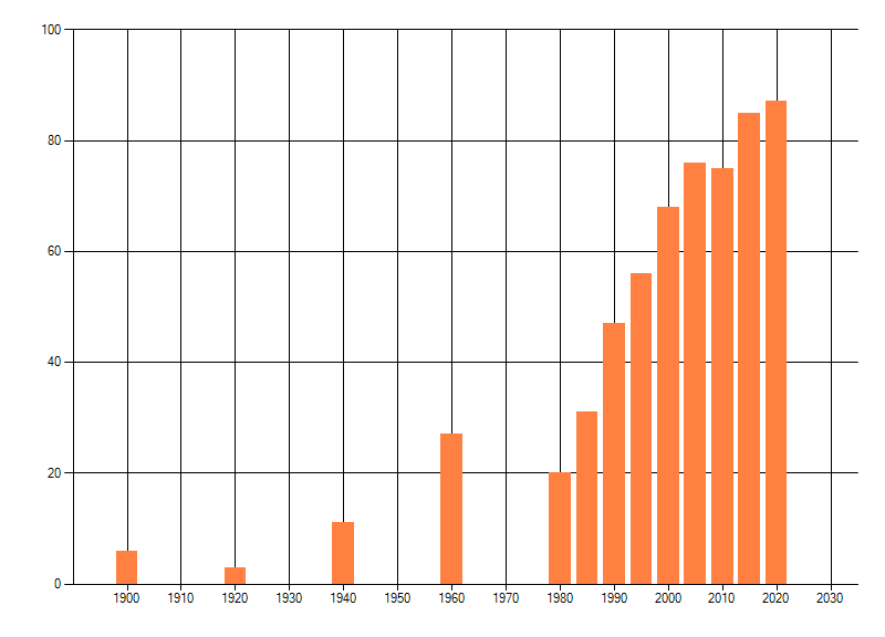 Het aantal atlasblokken (5x5 km) waarin de soort is gemeld binnen een periode van vijf jaar (vanaf 1980) of twintig jaar. Niet gecorrigeerd voor waarnemersinspanning en het aantal doorgegeven waarnemingen kan sterk variëren per periode, dus een trend in verspreiding kan hier niet direct uit worden afgelezen. Het opgegeven jaartal is het eerste jaar van de periode. Bron: gevalideerde waarnemingen uit de NDFF.