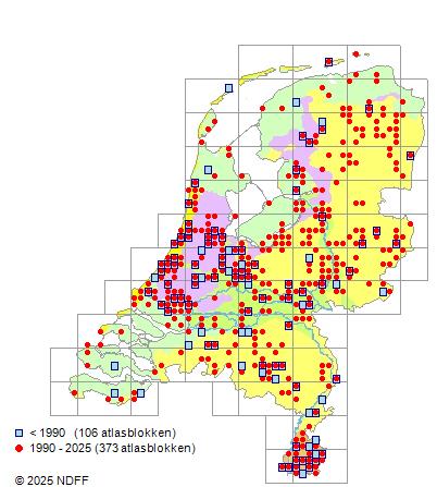 Het aantal atlasblokken (5x5 km) waarin de soort is gemeld binnen een periode van vijf jaar (vanaf 1980) of twintig jaar. Niet gecorrigeerd voor waarnemersinspanning en het aantal doorgegeven waarnemingen kan sterk variëren per periode, dus een trend in verspreiding kan hier niet direct uit worden afgelezen. Het opgegeven jaartal is het eerste jaar van de periode. Bron: gevalideerde waarnemingen uit de NDFF.