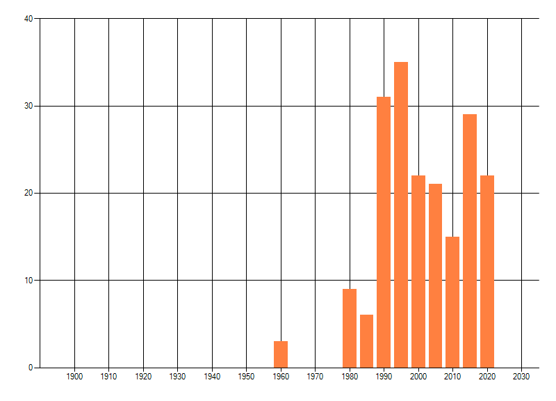 Het aantal atlasblokken (5x5 km) waarin de soort is gemeld binnen een periode van vijf jaar (vanaf 1980) of twintig jaar. Niet gecorrigeerd voor waarnemersinspanning en het aantal doorgegeven waarnemingen kan sterk variëren per periode, dus een trend in verspreiding kan hier niet direct uit worden afgelezen. Het opgegeven jaartal is het eerste jaar van de periode. Bron: gevalideerde waarnemingen uit de NDFF.