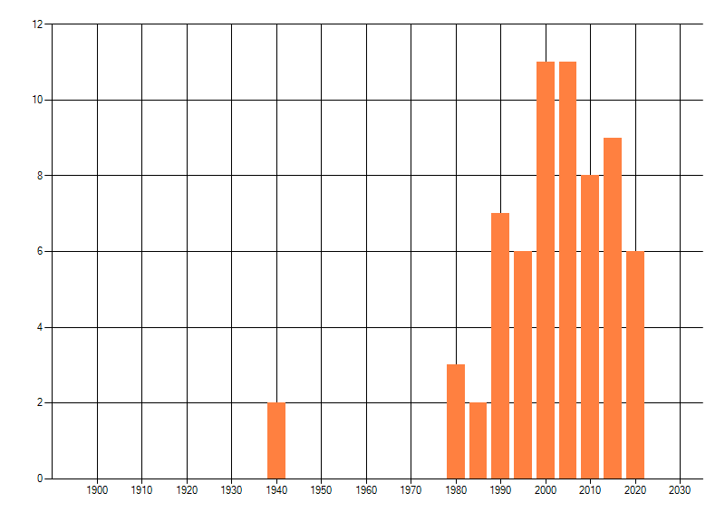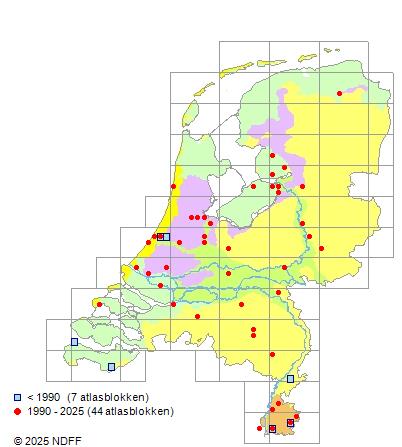 Het aantal atlasblokken (5x5 km) waarin de soort is gemeld binnen een periode van vijf jaar (vanaf 1980) of twintig jaar. Niet gecorrigeerd voor waarnemersinspanning en het aantal doorgegeven waarnemingen kan sterk variëren per periode, dus een trend in verspreiding kan hier niet direct uit worden afgelezen. Het opgegeven jaartal is het eerste jaar van de periode. Bron: gevalideerde waarnemingen uit de NDFF.
