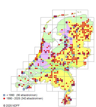 Het aantal atlasblokken (5x5 km) waarin de soort is gemeld binnen een periode van vijf jaar (vanaf 1980) of twintig jaar. Niet gecorrigeerd voor waarnemersinspanning en het aantal doorgegeven waarnemingen kan sterk variëren per periode, dus een trend in verspreiding kan hier niet direct uit worden afgelezen. Het opgegeven jaartal is het eerste jaar van de periode. Bron: gevalideerde waarnemingen uit de NDFF.
