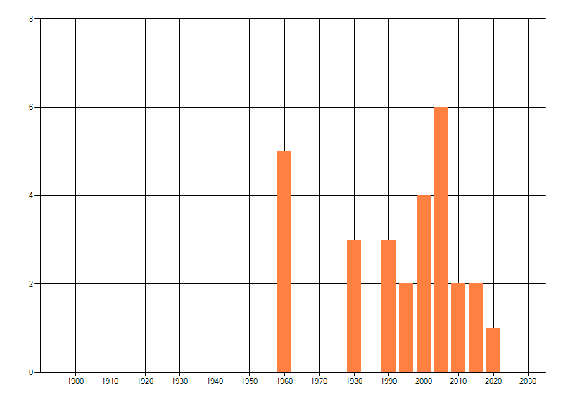 Het aantal atlasblokken (5x5 km) waarin de soort is gemeld binnen een periode van vijf jaar (vanaf 1980) of twintig jaar. Niet gecorrigeerd voor waarnemersinspanning en het aantal doorgegeven waarnemingen kan sterk variëren per periode, dus een trend in verspreiding kan hier niet direct uit worden afgelezen. Het opgegeven jaartal is het eerste jaar van de periode. Bron: gevalideerde waarnemingen uit de NDFF.