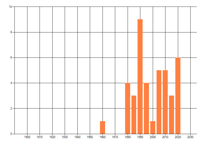 Het aantal atlasblokken (5x5 km) waarin de soort is gemeld binnen een periode van vijf jaar (vanaf 1980) of twintig jaar. Niet gecorrigeerd voor waarnemersinspanning en het aantal doorgegeven waarnemingen kan sterk variëren per periode, dus een trend in verspreiding kan hier niet direct uit worden afgelezen. Het opgegeven jaartal is het eerste jaar van de periode. Bron: gevalideerde waarnemingen uit de NDFF.