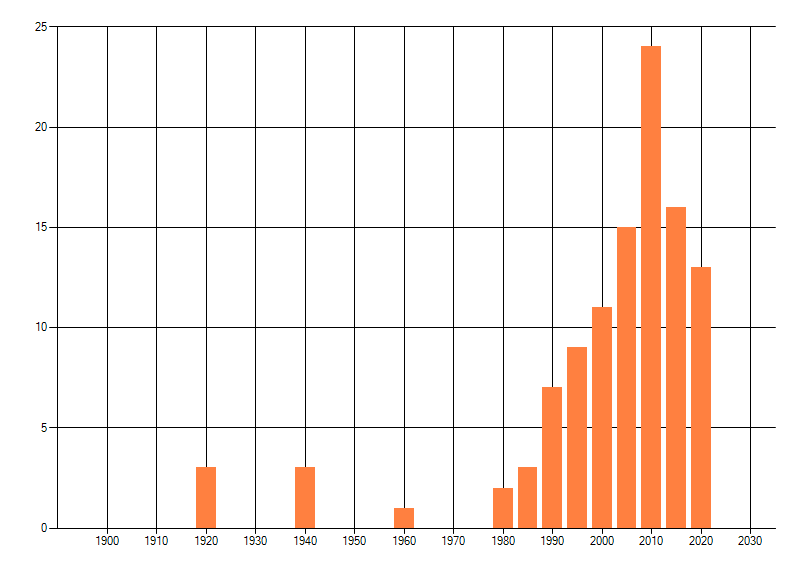 Het aantal atlasblokken (5x5 km) waarin de soort is gemeld binnen een periode van vijf jaar (vanaf 1980) of twintig jaar. Niet gecorrigeerd voor waarnemersinspanning en het aantal doorgegeven waarnemingen kan sterk variëren per periode, dus een trend in verspreiding kan hier niet direct uit worden afgelezen. Het opgegeven jaartal is het eerste jaar van de periode. Bron: gevalideerde waarnemingen uit de NDFF.