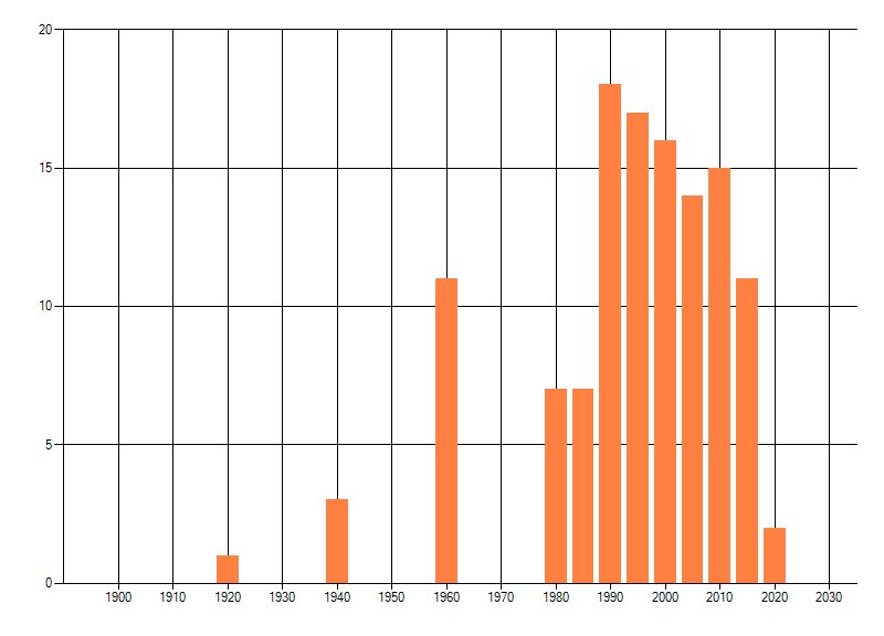 Het aantal atlasblokken (5x5 km) waarin de soort is gemeld binnen een periode van vijf jaar (vanaf 1980) of twintig jaar. Niet gecorrigeerd voor waarnemersinspanning en het aantal doorgegeven waarnemingen kan sterk variëren per periode, dus een trend in verspreiding kan hier niet direct uit worden afgelezen. Het opgegeven jaartal is het eerste jaar van de periode. Bron: gevalideerde waarnemingen uit de NDFF.