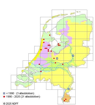 Het aantal atlasblokken (5x5 km) waarin de soort is gemeld binnen een periode van vijf jaar (vanaf 1980) of twintig jaar. Niet gecorrigeerd voor waarnemersinspanning en het aantal doorgegeven waarnemingen kan sterk variëren per periode, dus een trend in verspreiding kan hier niet direct uit worden afgelezen. Het opgegeven jaartal is het eerste jaar van de periode. Bron: gevalideerde waarnemingen uit de NDFF.