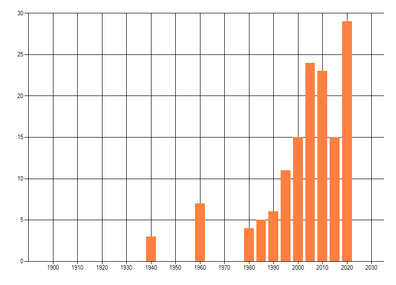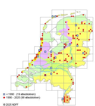 Het aantal atlasblokken (5x5 km) waarin de soort is gemeld binnen een periode van vijf jaar (vanaf 1980) of twintig jaar. Niet gecorrigeerd voor waarnemersinspanning en het aantal doorgegeven waarnemingen kan sterk variëren per periode, dus een trend in verspreiding kan hier niet direct uit worden afgelezen. Het opgegeven jaartal is het eerste jaar van de periode. Bron: gevalideerde waarnemingen uit de NDFF.