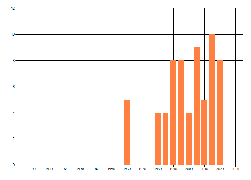 Het aantal atlasblokken (5x5 km) waarin de soort is gemeld binnen een periode van vijf jaar (vanaf 1980) of twintig jaar. Niet gecorrigeerd voor waarnemersinspanning en het aantal doorgegeven waarnemingen kan sterk variëren per periode, dus een trend in verspreiding kan hier niet direct uit worden afgelezen. Het opgegeven jaartal is het eerste jaar van de periode. Bron: gevalideerde waarnemingen uit de NDFF.