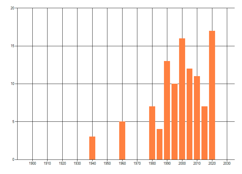 Het aantal atlasblokken (5x5 km) waarin de soort is gemeld binnen een periode van vijf jaar (vanaf 1980) of twintig jaar. Niet gecorrigeerd voor waarnemersinspanning en het aantal doorgegeven waarnemingen kan sterk variëren per periode, dus een trend in verspreiding kan hier niet direct uit worden afgelezen. Het opgegeven jaartal is het eerste jaar van de periode. Bron: gevalideerde waarnemingen uit de NDFF.