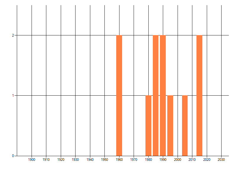 Het aantal atlasblokken (5x5 km) waarin de soort is gemeld binnen een periode van vijf jaar (vanaf 1980) of twintig jaar. Niet gecorrigeerd voor waarnemersinspanning en het aantal doorgegeven waarnemingen kan sterk variëren per periode, dus een trend in verspreiding kan hier niet direct uit worden afgelezen. Het opgegeven jaartal is het eerste jaar van de periode. Bron: gevalideerde waarnemingen uit de NDFF.