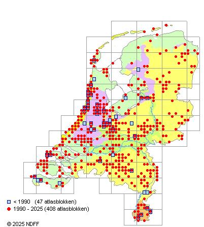 Het aantal atlasblokken (5x5 km) waarin de soort is gemeld binnen een periode van vijf jaar (vanaf 1980) of twintig jaar. Niet gecorrigeerd voor waarnemersinspanning en het aantal doorgegeven waarnemingen kan sterk variëren per periode, dus een trend in verspreiding kan hier niet direct uit worden afgelezen. Het opgegeven jaartal is het eerste jaar van de periode. Bron: gevalideerde waarnemingen uit de NDFF.