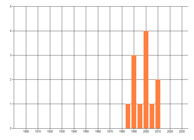 Het aantal atlasblokken (5x5 km) waarin de soort is gemeld binnen een periode van vijf jaar (vanaf 1980) of twintig jaar. Niet gecorrigeerd voor waarnemersinspanning en het aantal doorgegeven waarnemingen kan sterk variëren per periode, dus een trend in verspreiding kan hier niet direct uit worden afgelezen. Het opgegeven jaartal is het eerste jaar van de periode. Bron: gevalideerde waarnemingen uit de NDFF.