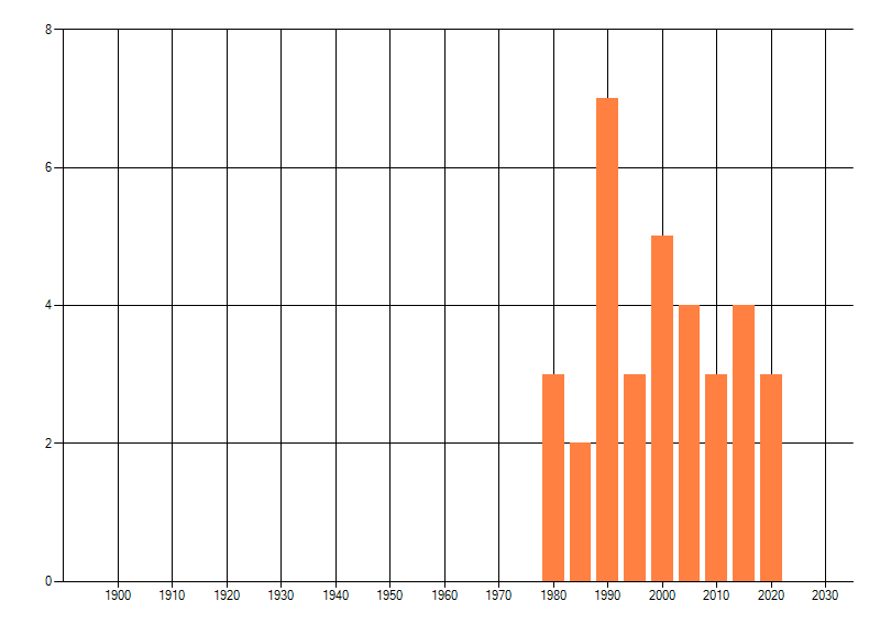 Het aantal atlasblokken (5x5 km) waarin de soort is gemeld binnen een periode van vijf jaar (vanaf 1980) of twintig jaar. Niet gecorrigeerd voor waarnemersinspanning en het aantal doorgegeven waarnemingen kan sterk variëren per periode, dus een trend in verspreiding kan hier niet direct uit worden afgelezen. Het opgegeven jaartal is het eerste jaar van de periode. Bron: gevalideerde waarnemingen uit de NDFF.