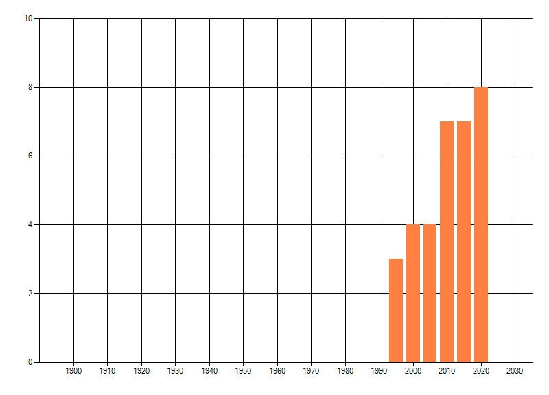 Het aantal atlasblokken (5x5 km) waarin de soort is gemeld binnen een periode van vijf jaar (vanaf 1980) of twintig jaar. Niet gecorrigeerd voor waarnemersinspanning en het aantal doorgegeven waarnemingen kan sterk variëren per periode, dus een trend in verspreiding kan hier niet direct uit worden afgelezen. Het opgegeven jaartal is het eerste jaar van de periode. Bron: gevalideerde waarnemingen uit de NDFF.