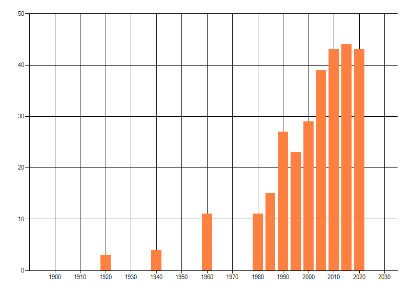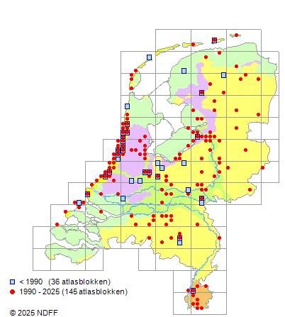 Het aantal atlasblokken (5x5 km) waarin de soort is gemeld binnen een periode van vijf jaar (vanaf 1980) of twintig jaar. Niet gecorrigeerd voor waarnemersinspanning en het aantal doorgegeven waarnemingen kan sterk variëren per periode, dus een trend in verspreiding kan hier niet direct uit worden afgelezen. Het opgegeven jaartal is het eerste jaar van de periode. Bron: gevalideerde waarnemingen uit de NDFF.