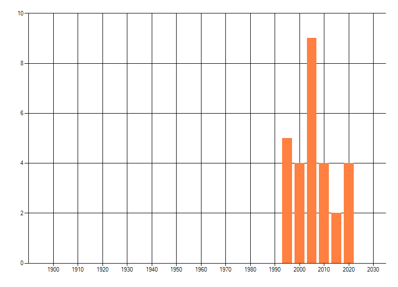 Het aantal atlasblokken (5x5 km) waarin de soort is gemeld binnen een periode van vijf jaar (vanaf 1980) of twintig jaar. Niet gecorrigeerd voor waarnemersinspanning en het aantal doorgegeven waarnemingen kan sterk variëren per periode, dus een trend in verspreiding kan hier niet direct uit worden afgelezen. Het opgegeven jaartal is het eerste jaar van de periode. Bron: gevalideerde waarnemingen uit de NDFF.