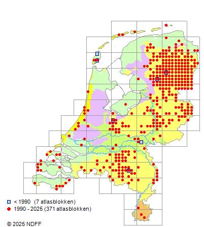 Het aantal atlasblokken (5x5 km) waarin de soort is gemeld binnen een periode van vijf jaar (vanaf 1980) of twintig jaar. Niet gecorrigeerd voor waarnemersinspanning en het aantal doorgegeven waarnemingen kan sterk variëren per periode, dus een trend in verspreiding kan hier niet direct uit worden afgelezen. Het opgegeven jaartal is het eerste jaar van de periode. Bron: gevalideerde waarnemingen uit de NDFF.