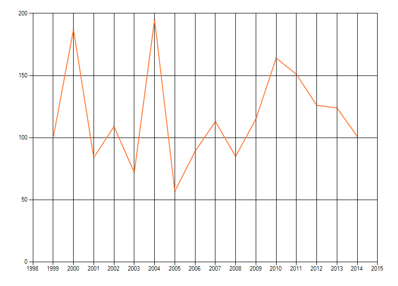 Trend in het geschatte aantal individuen van paddenstoelen in bossen op de hoge zandgronden, weergegeven als indexcijfer (eerste jaar = 100). Bron: