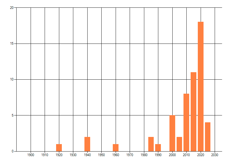 Het aantal atlasblokken (5x5 km) waarin de soort is gemeld binnen een periode van vijf jaar (vanaf 1980) of twintig jaar. Niet gecorrigeerd voor waarnemersinspanning en het aantal doorgegeven waarnemingen kan sterk variëren per periode, dus een trend in verspreiding kan hier niet direct uit worden afgelezen. Het opgegeven jaartal is het eerste jaar van de periode. Bron: gevalideerde waarnemingen uit de NDFF.
