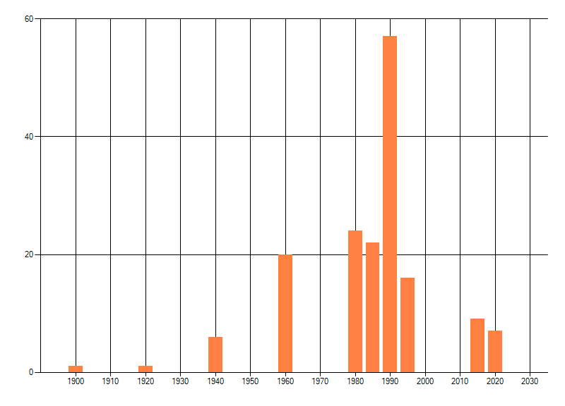 Het aantal atlasblokken (5x5 km) waarin de soort is gemeld binnen een periode van vijf jaar (vanaf 1980) of twintig jaar. Niet gecorrigeerd voor waarnemersinspanning en het aantal doorgegeven waarnemingen kan sterk variëren per periode, dus een trend in verspreiding kan hier niet direct uit worden afgelezen. Het opgegeven jaartal is het eerste jaar van de periode. Bron: gevalideerde waarnemingen uit de NDFF.