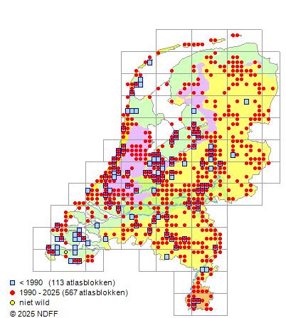 Het aantal atlasblokken (5x5 km) waarin de soort is gemeld binnen een periode van vijf jaar (vanaf 1980) of twintig jaar. Niet gecorrigeerd voor waarnemersinspanning en het aantal doorgegeven waarnemingen kan sterk variëren per periode, dus een trend in verspreiding kan hier niet direct uit worden afgelezen. Het opgegeven jaartal is het eerste jaar van de periode. Bron: gevalideerde waarnemingen uit de NDFF.