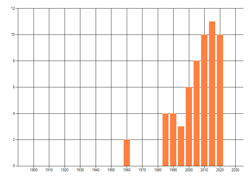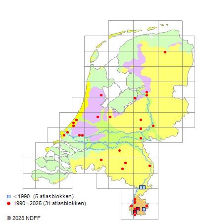 Het aantal atlasblokken (5x5 km) waarin de soort is gemeld binnen een periode van vijf jaar (vanaf 1980) of twintig jaar. Niet gecorrigeerd voor waarnemersinspanning en het aantal doorgegeven waarnemingen kan sterk variëren per periode, dus een trend in verspreiding kan hier niet direct uit worden afgelezen. Het opgegeven jaartal is het eerste jaar van de periode. Bron: gevalideerde waarnemingen uit de NDFF.