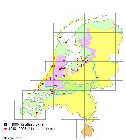 Het aantal atlasblokken (5x5 km) waarin de soort is gemeld binnen een periode van vijf jaar (vanaf 1980) of twintig jaar. Niet gecorrigeerd voor waarnemersinspanning en het aantal doorgegeven waarnemingen kan sterk variëren per periode, dus een trend in verspreiding kan hier niet direct uit worden afgelezen. Het opgegeven jaartal is het eerste jaar van de periode. Bron: gevalideerde waarnemingen uit de NDFF.