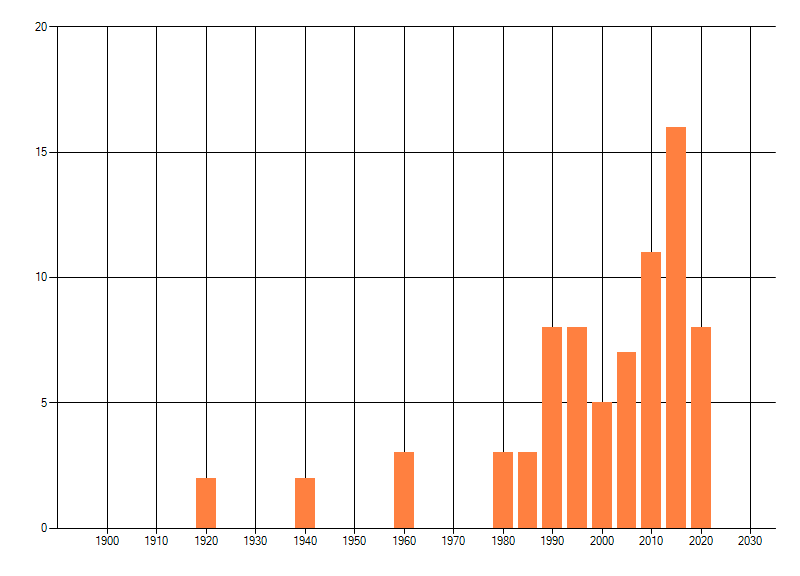 Het aantal atlasblokken (5x5 km) waarin de soort is gemeld binnen een periode van vijf jaar (vanaf 1980) of twintig jaar. Niet gecorrigeerd voor waarnemersinspanning en het aantal doorgegeven waarnemingen kan sterk variëren per periode, dus een trend in verspreiding kan hier niet direct uit worden afgelezen. Het opgegeven jaartal is het eerste jaar van de periode. Bron: gevalideerde waarnemingen uit de NDFF.