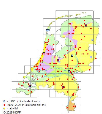 Het aantal atlasblokken (5x5 km) waarin de soort is gemeld binnen een periode van vijf jaar (vanaf 1980) of twintig jaar. Niet gecorrigeerd voor waarnemersinspanning en het aantal doorgegeven waarnemingen kan sterk variëren per periode, dus een trend in verspreiding kan hier niet direct uit worden afgelezen. Het opgegeven jaartal is het eerste jaar van de periode. Bron: gevalideerde waarnemingen uit de NDFF.