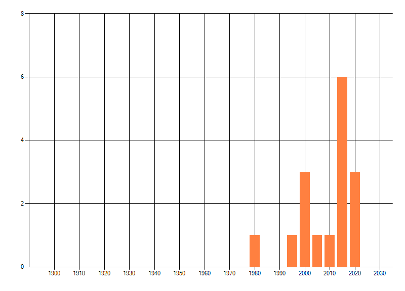 Het aantal atlasblokken (5x5 km) waarin de soort is gemeld binnen een periode van vijf jaar (vanaf 1980) of twintig jaar. Niet gecorrigeerd voor waarnemersinspanning en het aantal doorgegeven waarnemingen kan sterk variëren per periode, dus een trend in verspreiding kan hier niet direct uit worden afgelezen. Het opgegeven jaartal is het eerste jaar van de periode. Bron: gevalideerde waarnemingen uit de NDFF.