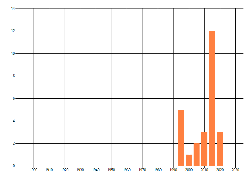 Het aantal atlasblokken (5x5 km) waarin de soort is gemeld binnen een periode van vijf jaar (vanaf 1980) of twintig jaar. Niet gecorrigeerd voor waarnemersinspanning en het aantal doorgegeven waarnemingen kan sterk variëren per periode, dus een trend in verspreiding kan hier niet direct uit worden afgelezen. Het opgegeven jaartal is het eerste jaar van de periode. Bron: gevalideerde waarnemingen uit de NDFF.