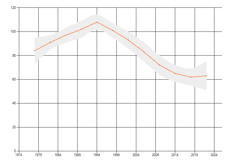 Gemiddelde trend van het aantal kilometerhokken waarin de soort voorkomt, weergegeven als indexcijfer (1975-1978 = 100).