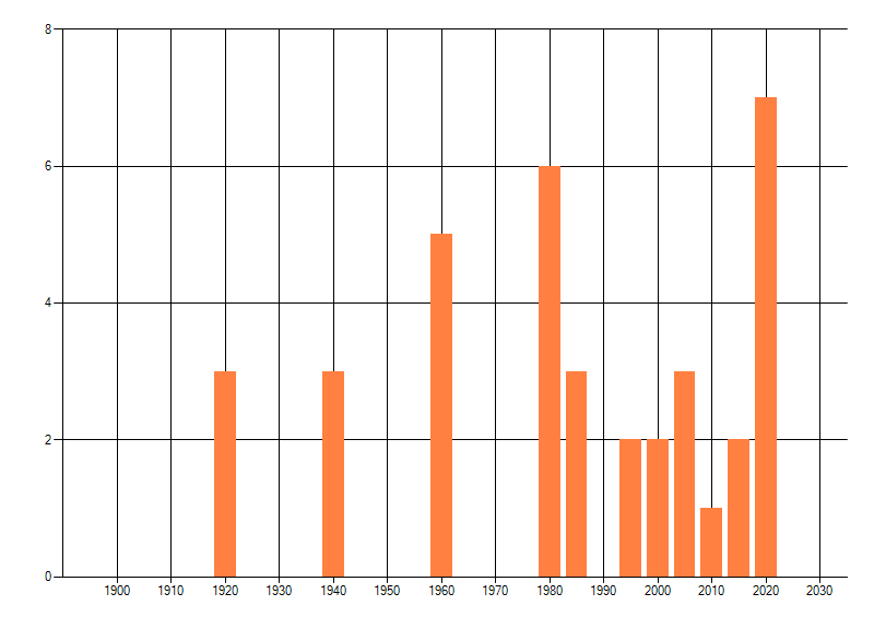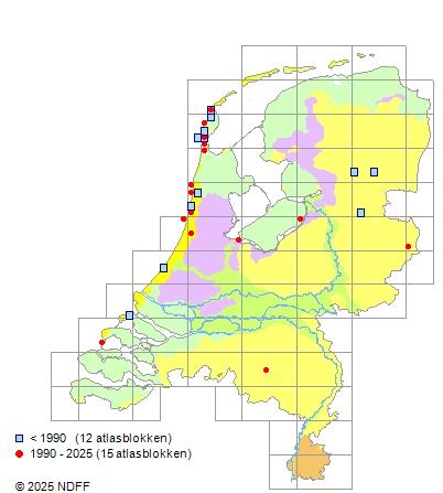Het aantal atlasblokken (5x5 km) waarin de soort is gemeld binnen een periode van vijf jaar (vanaf 1980) of twintig jaar. Niet gecorrigeerd voor waarnemersinspanning en het aantal doorgegeven waarnemingen kan sterk variëren per periode, dus een trend in verspreiding kan hier niet direct uit worden afgelezen. Het opgegeven jaartal is het eerste jaar van de periode. Bron: gevalideerde waarnemingen uit de NDFF.