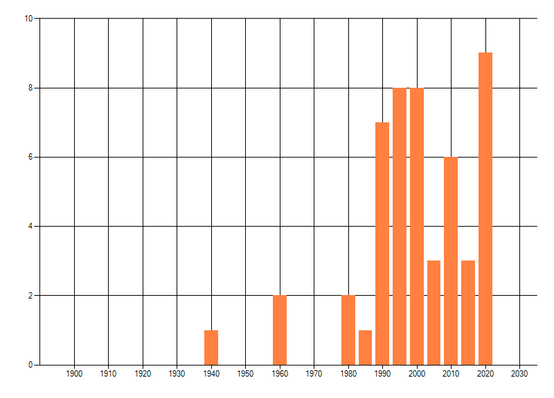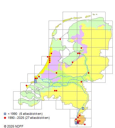 Het aantal atlasblokken (5x5 km) waarin de soort is gemeld binnen een periode van vijf jaar (vanaf 1980) of twintig jaar. Niet gecorrigeerd voor waarnemersinspanning en het aantal doorgegeven waarnemingen kan sterk variëren per periode, dus een trend in verspreiding kan hier niet direct uit worden afgelezen. Het opgegeven jaartal is het eerste jaar van de periode. Bron: gevalideerde waarnemingen uit de NDFF.