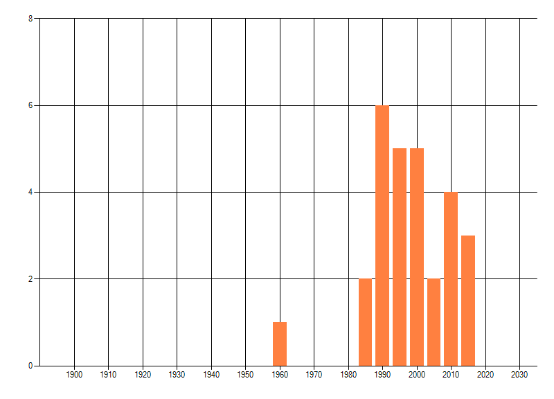 Het aantal atlasblokken (5x5 km) waarin de soort is gemeld binnen een periode van vijf jaar (vanaf 1980) of twintig jaar. Niet gecorrigeerd voor waarnemersinspanning en het aantal doorgegeven waarnemingen kan sterk variëren per periode, dus een trend in verspreiding kan hier niet direct uit worden afgelezen. Het opgegeven jaartal is het eerste jaar van de periode. Bron: gevalideerde waarnemingen uit de NDFF.