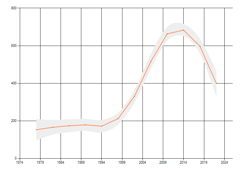 Gemiddelde trend van het aantal kilometerhokken waarin de soort voorkomt, weergegeven als indexcijfer (1975-1978 = 100). De trend is gecorrigeerd voor waarnemersinspanning en geeft de relatieve verandering in het aantal bezette kilometerhokken weer. Voor de berekening worden de data per periode van vier jaar samengenomen. In de grafiek correspondeert ieder punt met het laatste jaar van zo'n periode.