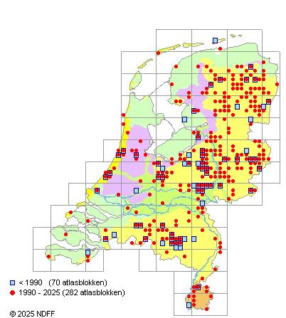Het aantal atlasblokken (5x5 km) waarin de soort is gemeld binnen een periode van vijf jaar (vanaf 1980) of twintig jaar. Niet gecorrigeerd voor waarnemersinspanning en het aantal doorgegeven waarnemingen kan sterk variëren per periode, dus een trend in verspreiding kan hier niet direct uit worden afgelezen. Het opgegeven jaartal is het eerste jaar van de periode. Bron: gevalideerde waarnemingen uit de NDFF.