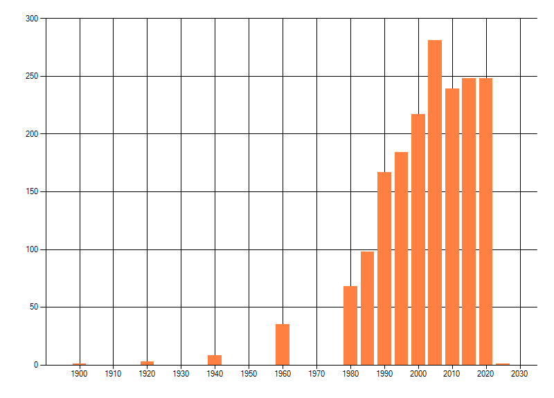 Het aantal atlasblokken (5x5 km) waarin de soort is gemeld binnen een periode van vijf jaar (vanaf 1980) of twintig jaar. Niet gecorrigeerd voor waarnemersinspanning en het aantal doorgegeven waarnemingen kan sterk variëren per periode, dus een trend in verspreiding kan hier niet direct uit worden afgelezen. Het opgegeven jaartal is het eerste jaar van de periode. Bron: gevalideerde waarnemingen uit de NDFF.